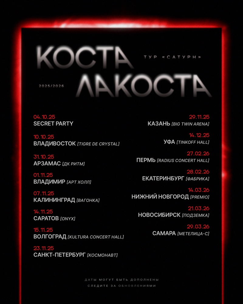 1 ноября 2025 года в Арт Холле города Владимира состоится большой сольный концерт поп-исполнителя Коста Лакоста в рамках тура «Сатурн».