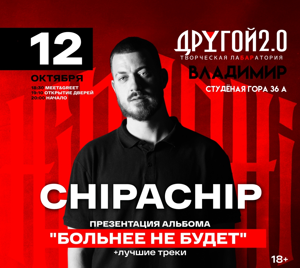 12 октября 2025 года в баре «Другой 2.0» города Владимира состоится концерт рэп-исполнителя ChipaChip. Вас ждут: все хиты и презентация нового материала! Не пропустите!